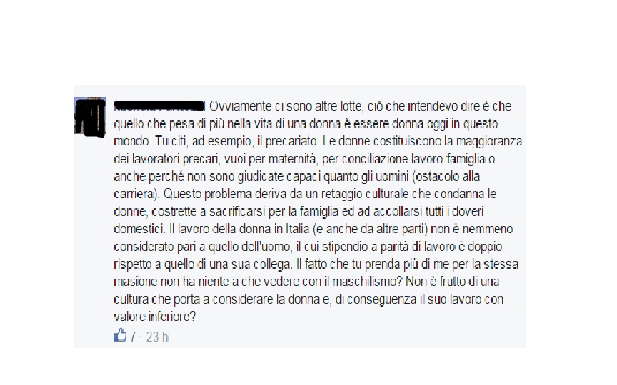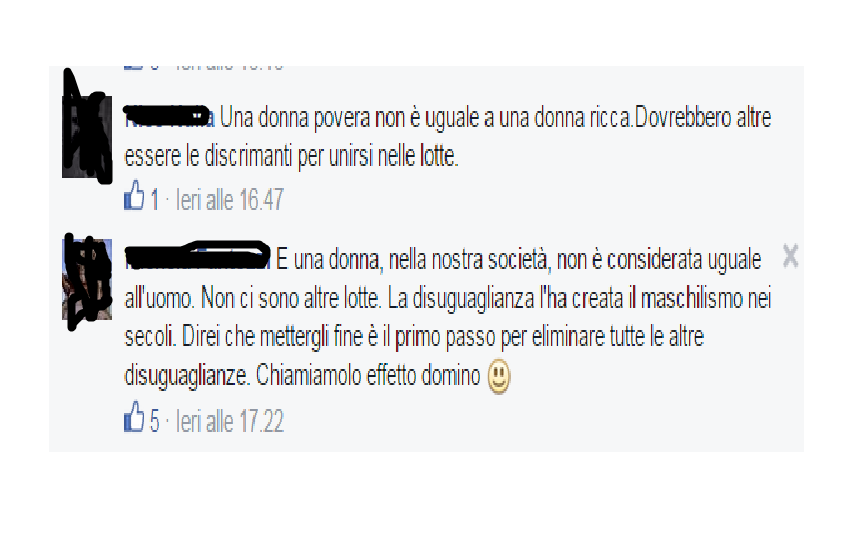Ovviamente non poteva mancare l’ evergreen maschilismo che ,sconfitto quello ,come d’incanto spariscono anche le altre discriminazioni , sparisce povertà ,disoccupazione, e la famosa fame e pace nel mondo tutto in un sol colpo ,chissà perchè la fanno cosi difficile ,eppure la soluzione è elementare 🙂 ,ed è ancora più ovvio (ma che lo scrivo a fare ?) che sono le donne più colpite da tutto questo e portano ad esempio la disparità dei salari