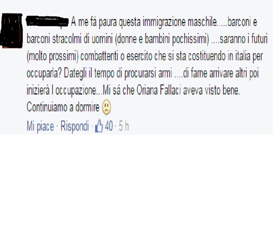 Ecco il punto focale , l’immigrazione già è una brutta bestia, mettici pure che sono quasi tutti uomini il peggio del peggio, ovviamente non mettono conto che, per esempio, i 700 migranti ( che qualche pagina di buontemponi ha messo con il -700) possono essere quasi tutti uomini no, niente di tutto questo ,sono uomini si armano e invadono l’occidente, creato dagli uomini che hanno il potere, un controsenso se ci pensate , questi hanno il potere e si fanno mettere sotto da questi baldi giovani africani ? Quindi bisogna anche capirsi