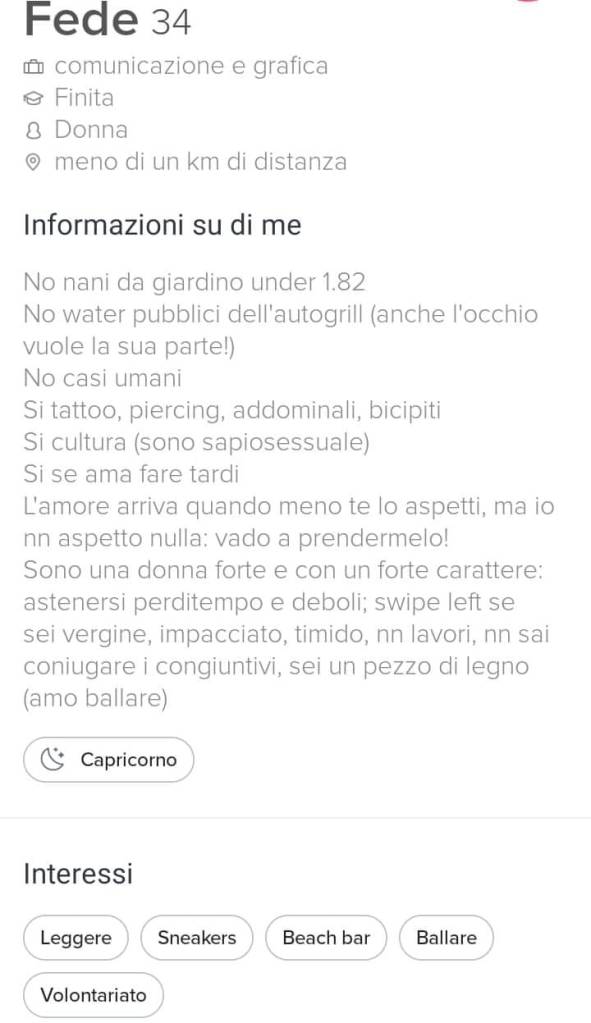 Da uno dei tanti profili per cercare la famosa “anima gemella”, ci sarebbe pure la foto della ragazza (oddio ha quasi 40 anni), ma non la metto perché è importante cosa cerca