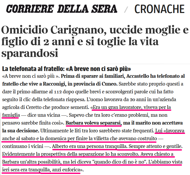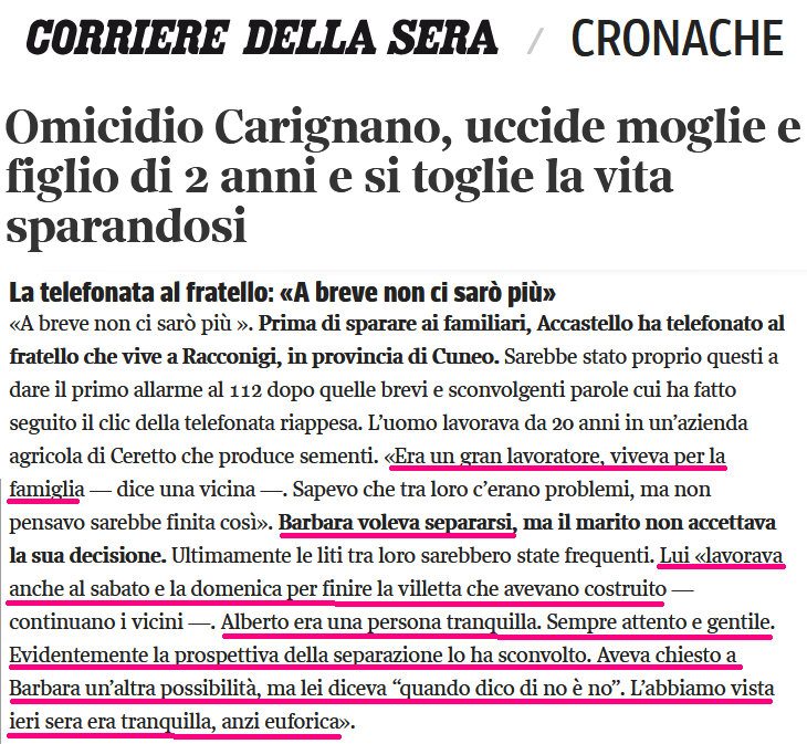 “Lui pensava solo al lavoro e lei aveva deciso di lasciarlo” – La Repubblica“Lui gran lavoratore, viveva per la famiglia… una persona tranquilla, sempre attenta e gentile. Lei euforica.” – Corriere della SeraQuesti sono i titoli e gli articoli di alcuni dei più importanti quotidiani in Italia relativi al pluriomicidio di Carignano, Torino.Insomma, lui un brav’uomo e lei una poco di buono “euforica” che lo lascia per un altro.Peccato che lui sia un pluriomicida che ha sterminato la sua famiglia, moglie e bimbo di 2 anni, compreso il cane e la figlia in fin di vita in ospedale.“È stato un raptus”, hanno scritto. Peccato che questo “raptus” è durato un bel po’, visto che gli stessi giornali scrivono che la pistola usata per ucciderli lui l’aveva comprata a fine ottobre e l’ha usata quasi due settimane dopo. E prima di compiere il terribile gesto ha chiamato il fratello per dirglielo.E per chi dice: “Eh, ma questi sono i fatti, questa è la dichiarazione della vicina, cosa dovevano scrivere?”No, questi non sono i fatti, questa è una precisa scelta di rappresentare un fatto in un determinato modo. Nessuno li ha costretti di scrivere le opinioni della vicina.Un uomo che lucidamente compra una pistola per sterminare la sua intera famiglia, evidentemente non è il brav’uomo che vogliono dipingere.E questa narrazione tossica, che colpevolizza la vittima, facendo passare il colpevole come vittima morale, non rimane là, sulla carta, ma si instilla nella mentalità della gente.Ed eccoli i commenti, da parte anche di molte donne, che se la prendono con lei.Lei, “la poco di buono che lo voleva lasciare”.Addirittura una donna dice: “Magari aver avuto un marito lavoratore come lui”, forse dimenticandosi che lui ha sterminato una famiglia intera.Ed infine, proliferano le pagine social di misogini, che vittimizzano gli uomini, li giustificano per i loro gesti atroci, colpevolizzando sempre le donne.Pagine che scrivono: “Non era possesso, era disperazione”. Peccato che il non accettare di essere lasciati dalla propria moglie, sia proprio indice di quel senso di possesso dell’uomo sulla vita della donna.E no, non è amore tradito, è la cultura patriarcale all’apice della sua gravità.Ecco perché i giornalisti che scrivono queste cose devono essere puniti dall’Ordine dei Giornalisti.Ecco perché queste pagine misogine devono essere chiuse.Perché se i femminicidi non si fermano è anche a causa di questa cultura patriarcale tossica che pervade la società.