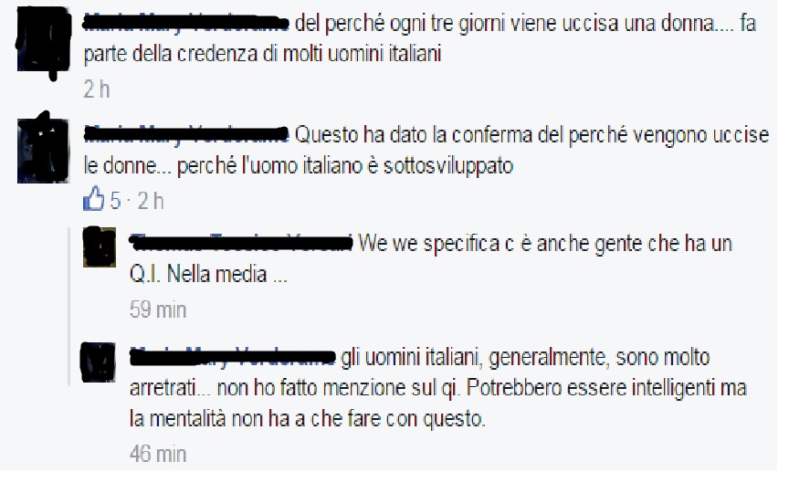 Non so quante volte l’ho postato ,ma se vediamo l’incidenza dei femminicdi in Europa, L’ Italia è un paese ad avere la percentuale più bassa , ho fatto anche un post al riguardo che indica dove c’è il gender gap più “virtuoso” ( quel decantato gender gap tanto amato dalla Zanardo) li c’è maggiore violenza e femminicdi in confronto delle donne ( per farci capire i paesi del nord Europa) …