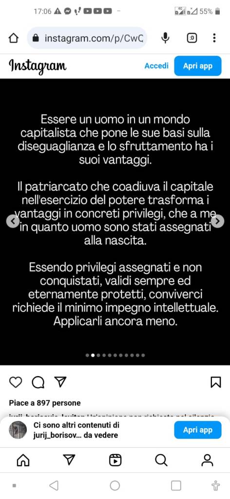 Meritati comunque, perchè un comunista (la storia va avanti su instagram, ma basta questo) mette gli uomini come privilegiati ,vuol dire non avere mai lavorato in vita sua e non è una frase fatta, questi personaggi politici qui meritano la Meloni in vita eterna (è anche una donna , gli farà piacere), ma voglio soffermarmi su quello dopo