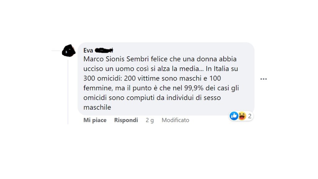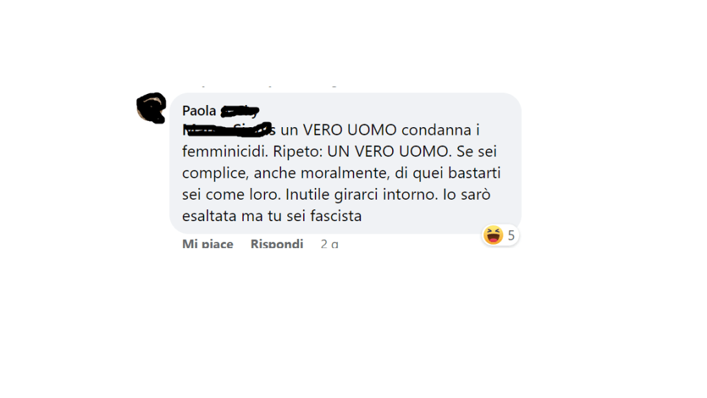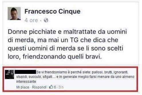 I commenti sono di questo tipo (lo ripeto ancora non delle donne in generale), non manca il sempre verde fascista messo li quando gli ricordi che non solo gli uomini possono essere violenti