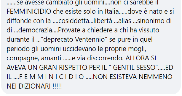 Invece di criticare il femminismo per quello che è cioè una stampella del capitale e del mondo occidentale, e che è un continuo disprezza mento del genere maschile, lo si critica dalla parte sbagliata, addirittura pronunciando che, nel ventennio fascista, non esistessero omicidi del genere, tralascio il fatto che, secondo il nostro “tradizionalista” sia un problema solo italiano, vuol dire informarsi con topolino