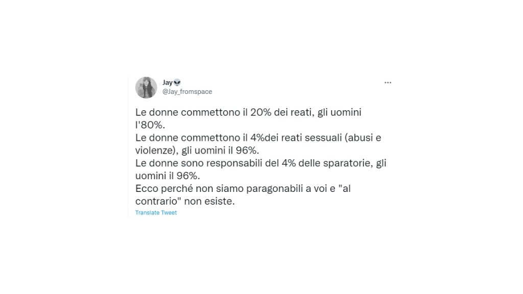 Dite che somiglia a qualche discorso suprematista dove, per screditare una etnia (in questo caso sesso) si mette in mostra i dati sui reati commessi?